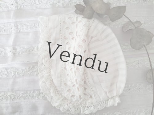 - > フランスアンティーク ぽんぽんつきチュールレースのちいさなボネ