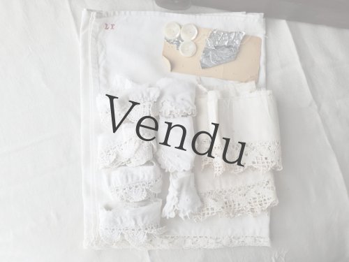蚤の市で出会った、刺繍入りの端切れにレーストリム、ボタンシートを加えた大変お得なセットです。