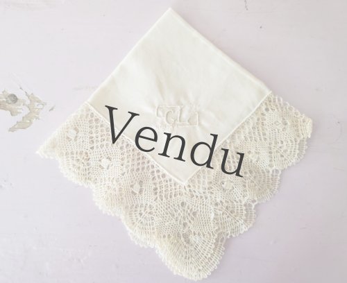 フランスヴィンテージ ボビンレースハンカチ イニシャル刺繍 MS