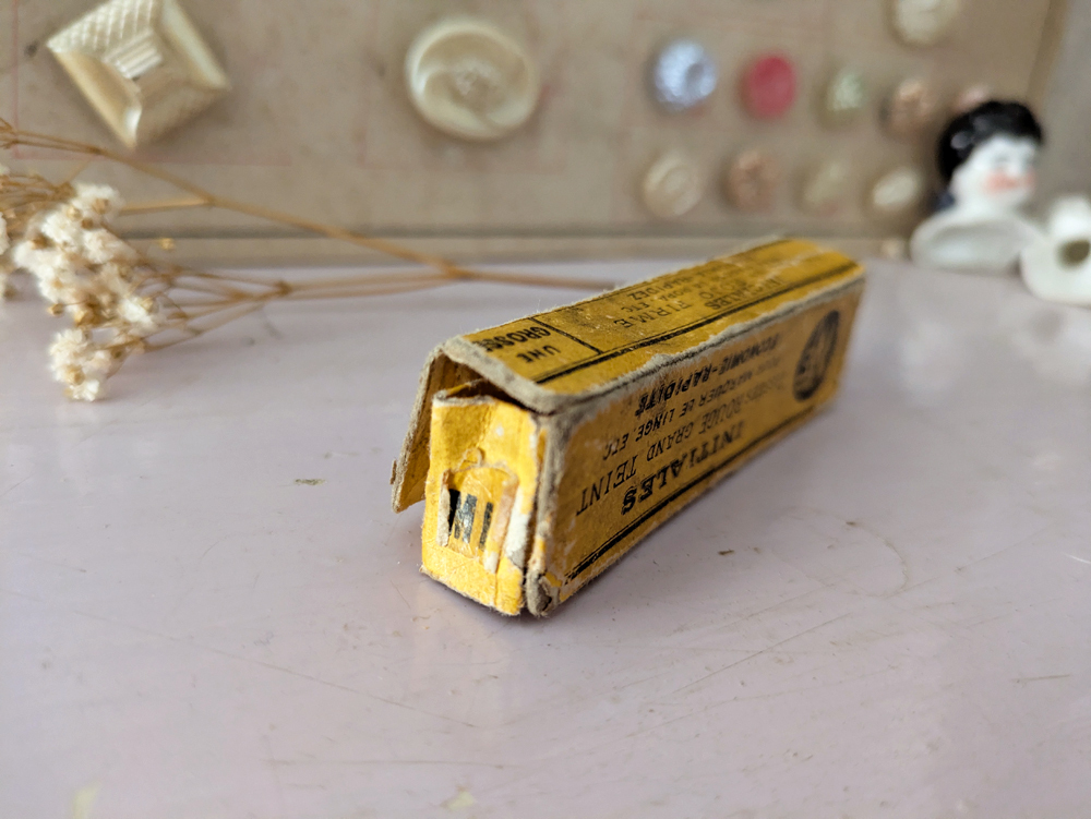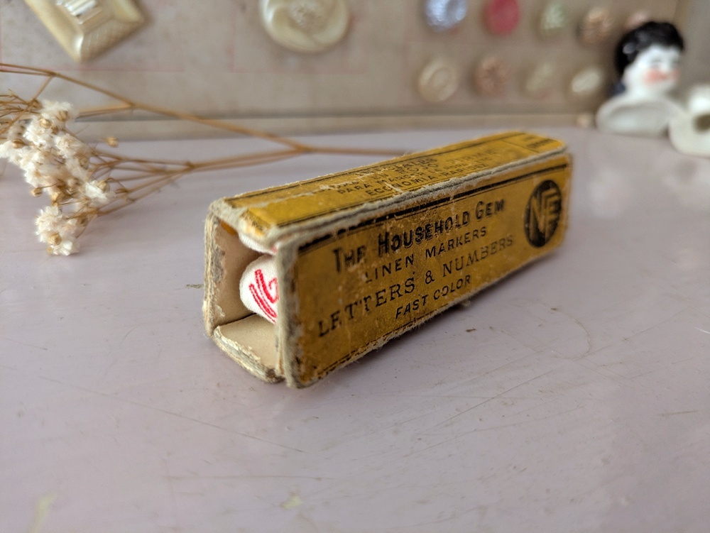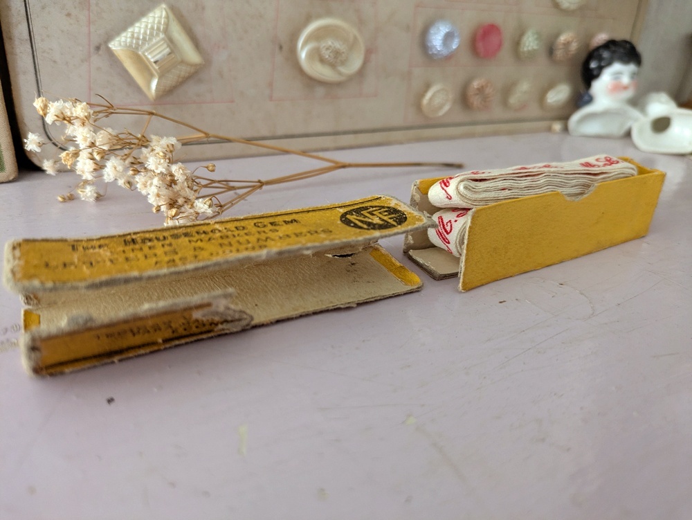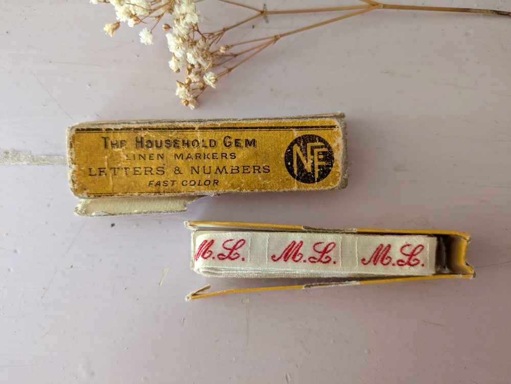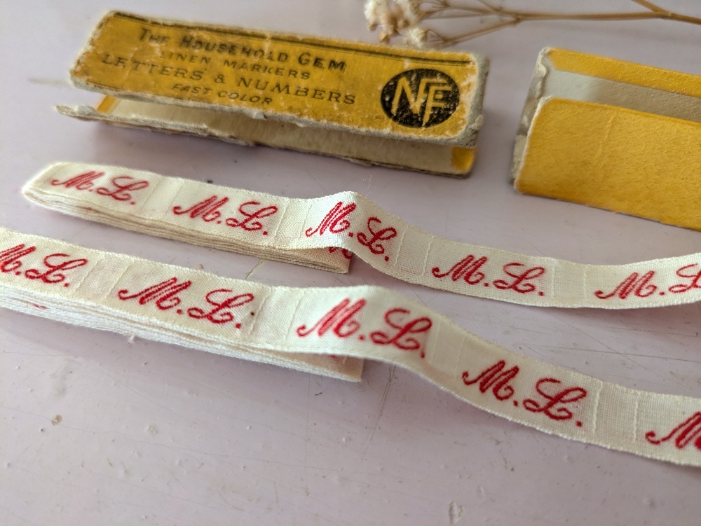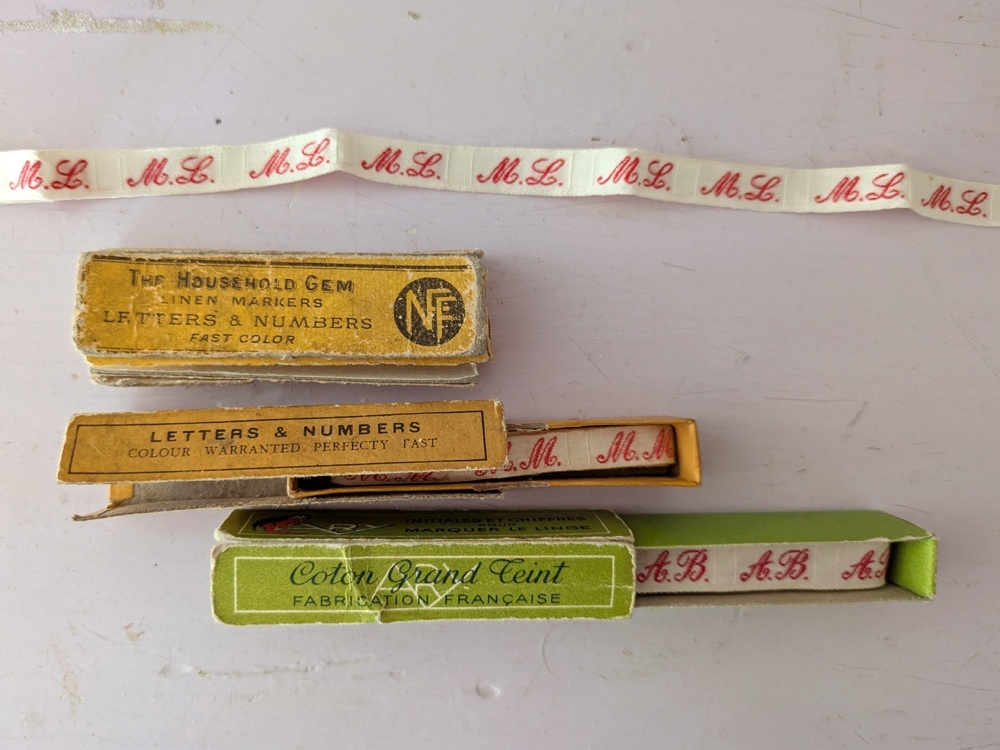 イニシャルテープは衣服や寝間着の裾などに縫いつけ使用されていました。