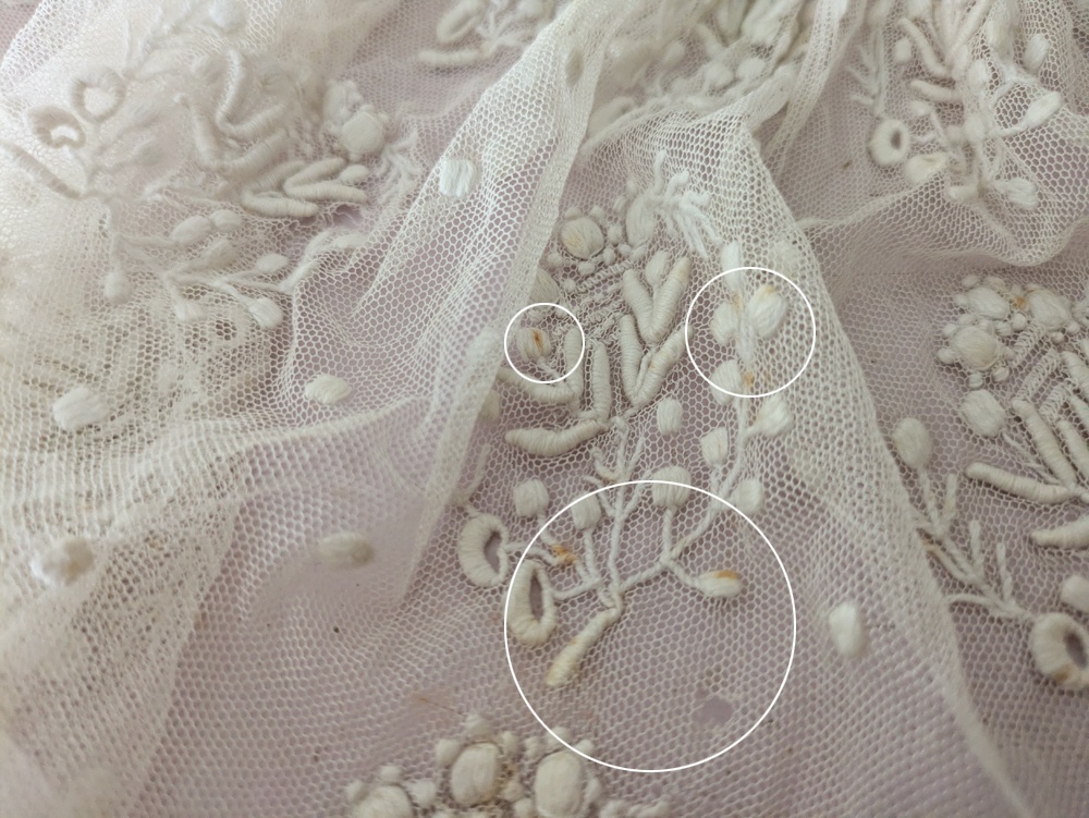 経年により複数個所に茶色いシミと小さなホールがあります。