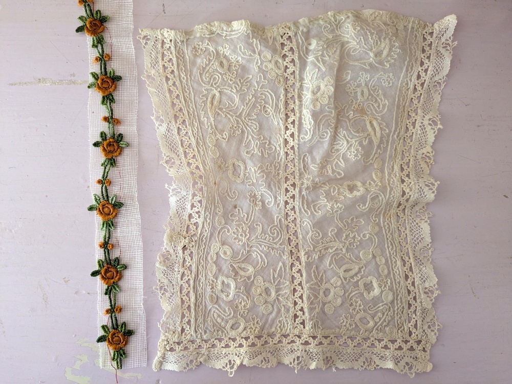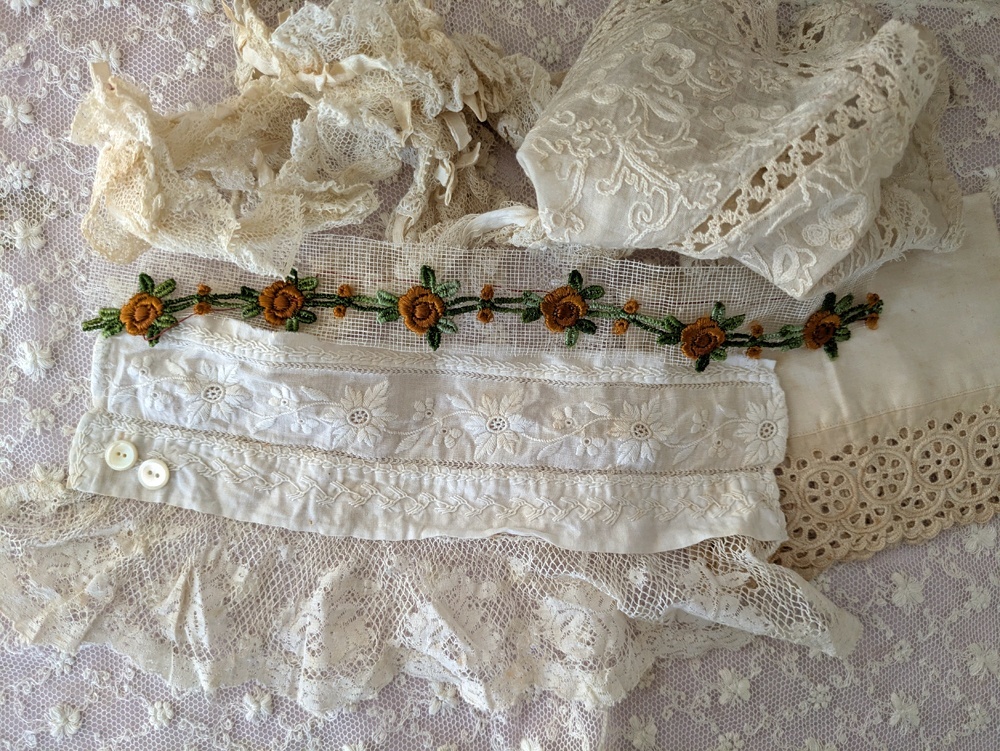 - > フランスアンティーク はぎれパーツセット+ばらのトリム+貝ボタンつき
