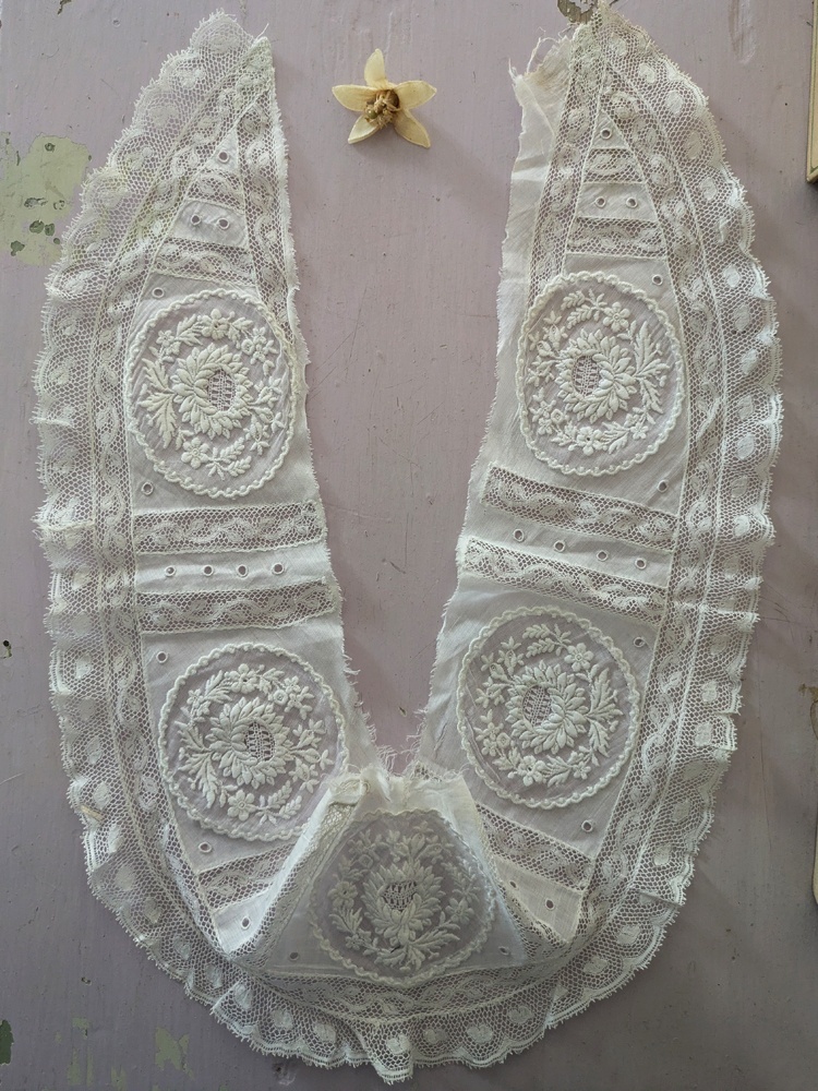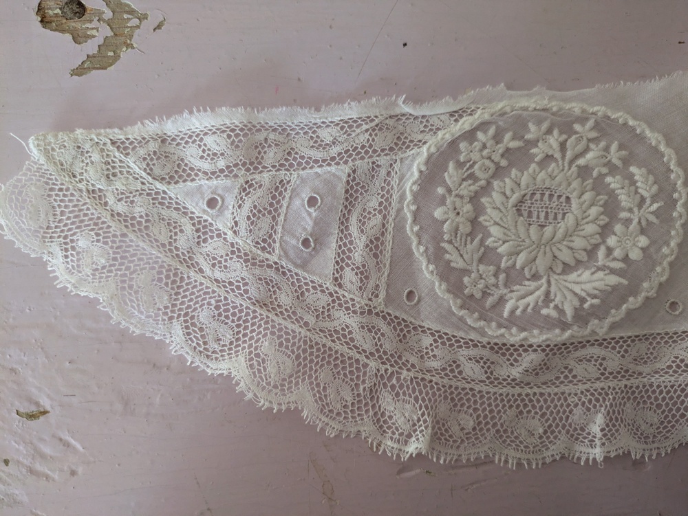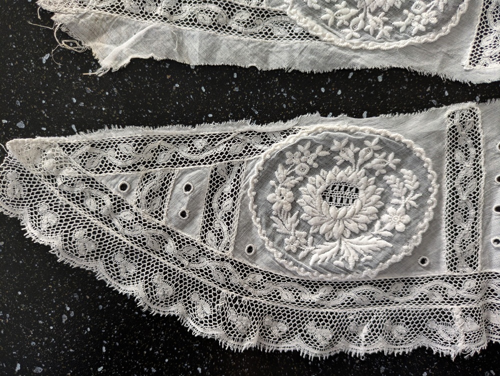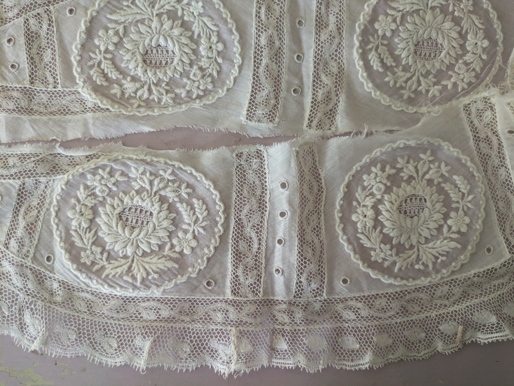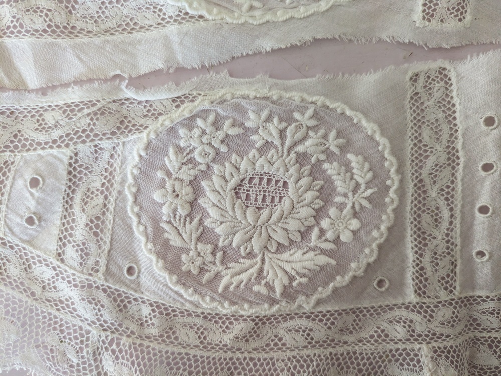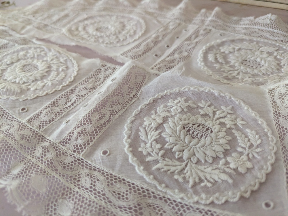 - > フランスアンティーク 白糸刺繍とヴァランシエンヌレースのはぎれパーツ