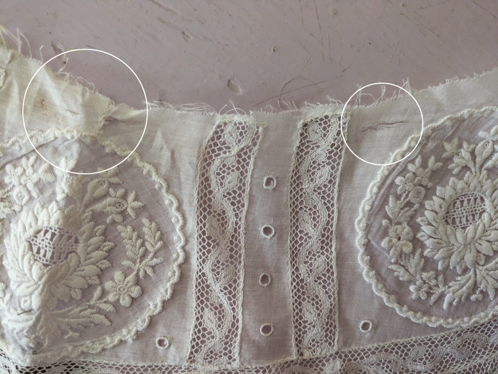 薄いローン地に繊細な白糸刺繍とヴァランシエンヌレースが組み合わされた美しいはぎれです。
