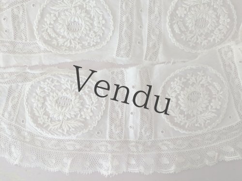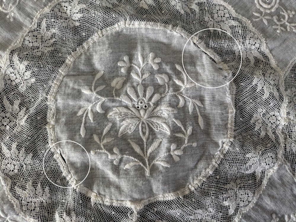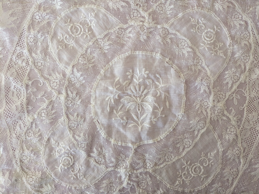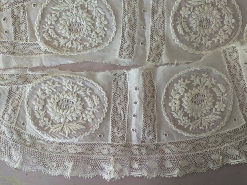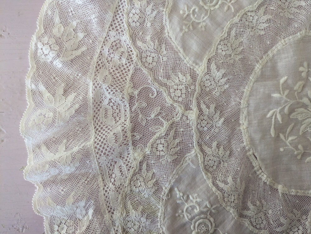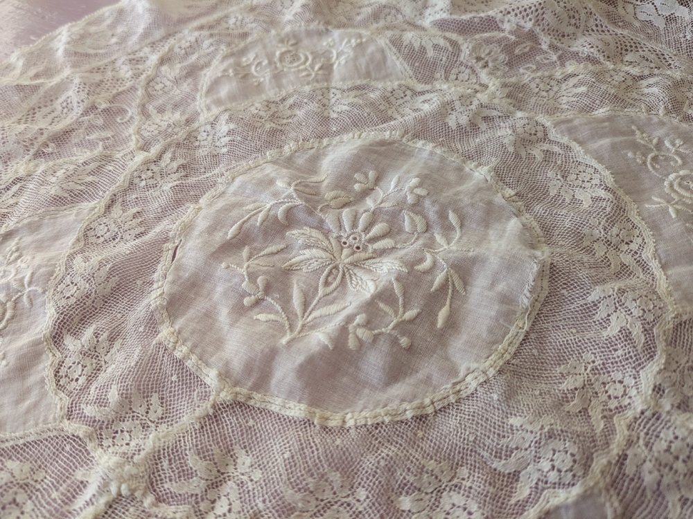 何種類ものレースや白糸刺繍を繋ぎ合わせて作られています。