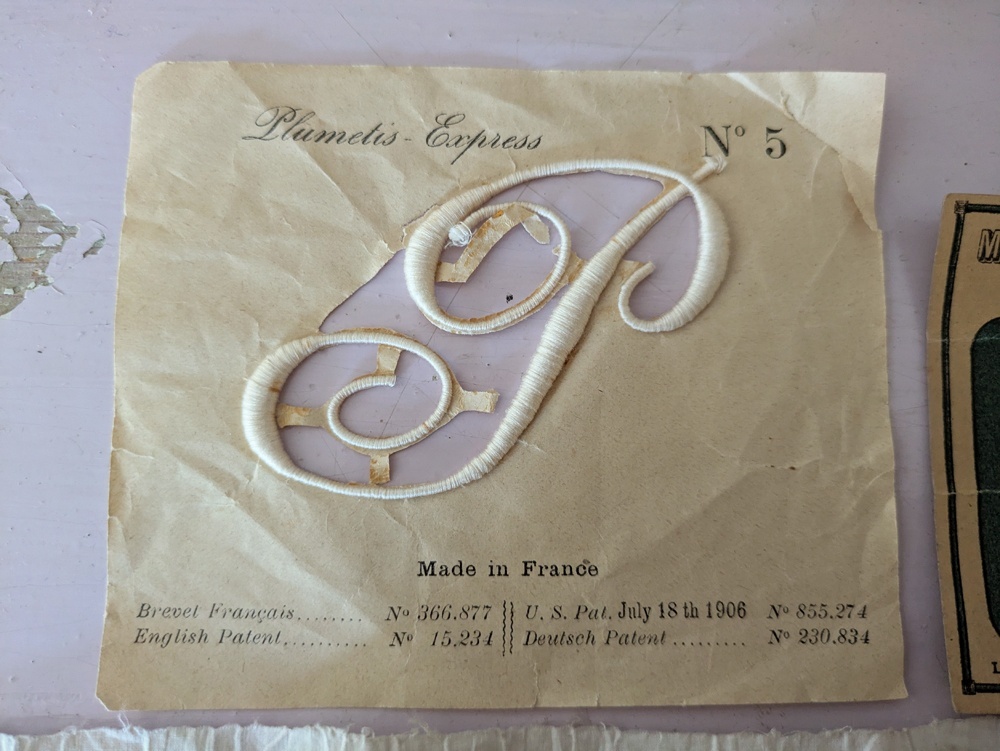 DMCの刺繍糸、L.V.&M.F.A.のアルファベ刺繍図案、プリュムティス刺繍シート、スカラップ刺繍木製スタンプ、貝ボタンシート、スカラップレースなど6点を合わせた特別なメルスリーセットです。