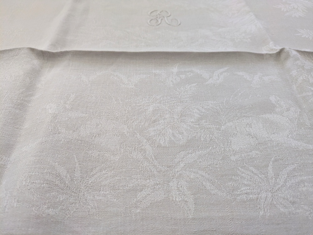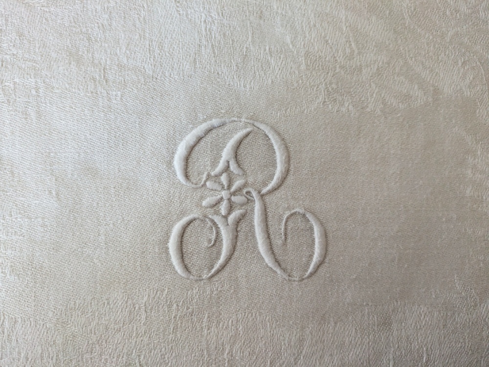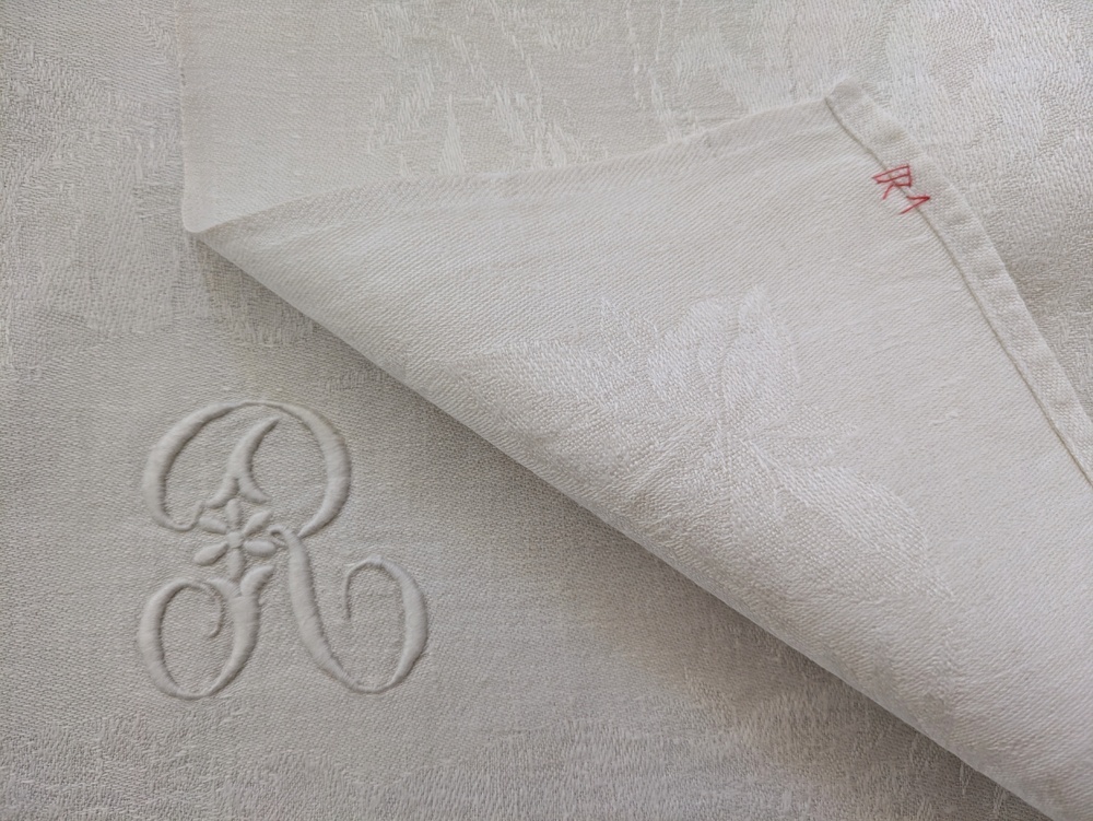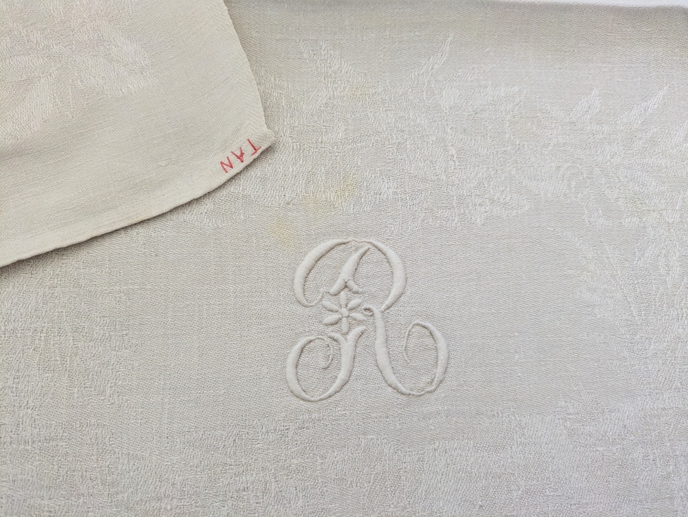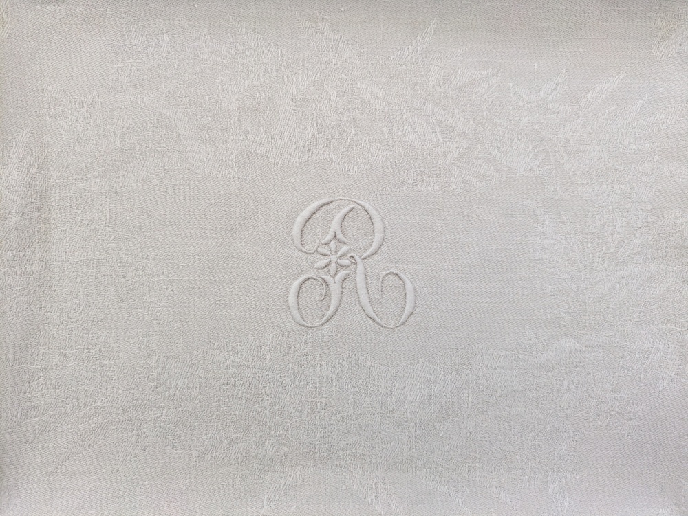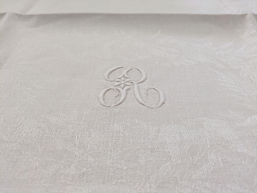 - > フランスアンティーク イニシャル手刺繍R ダマスク織リネンクロス