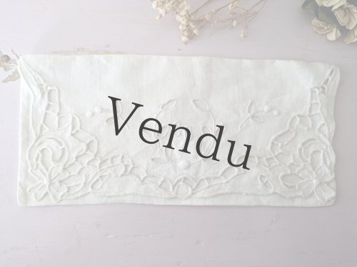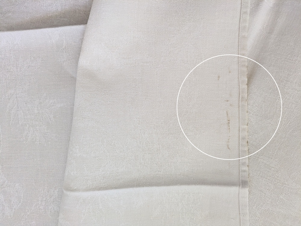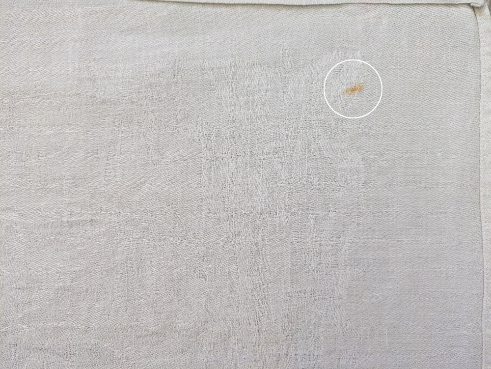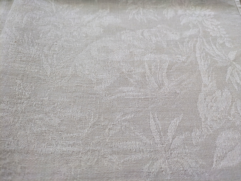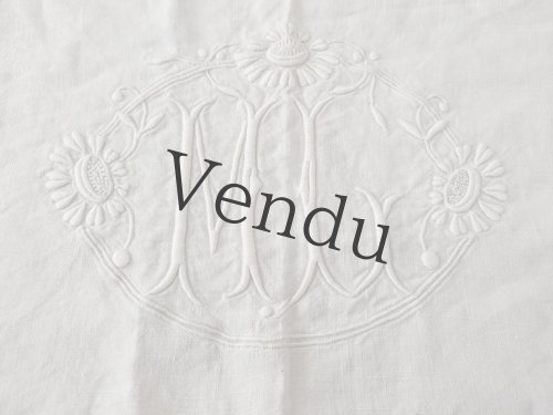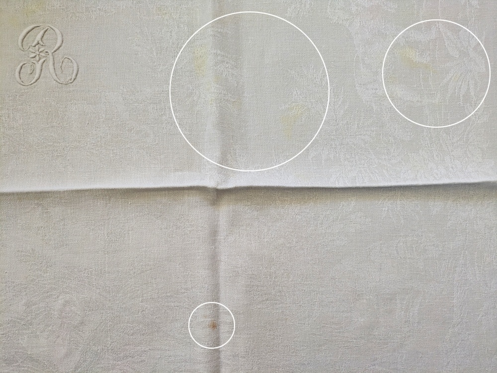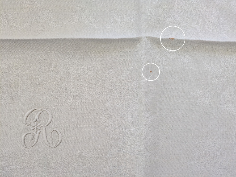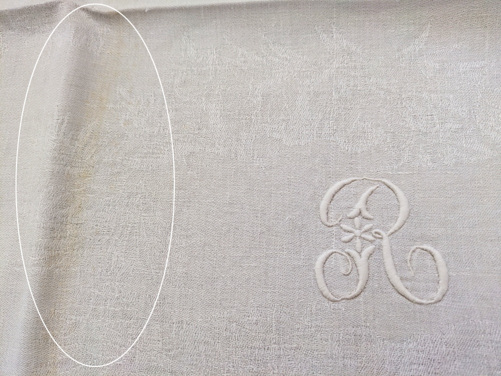 - > フランスアンティーク イニシャル手刺繍R ダマスク織リネンクロス