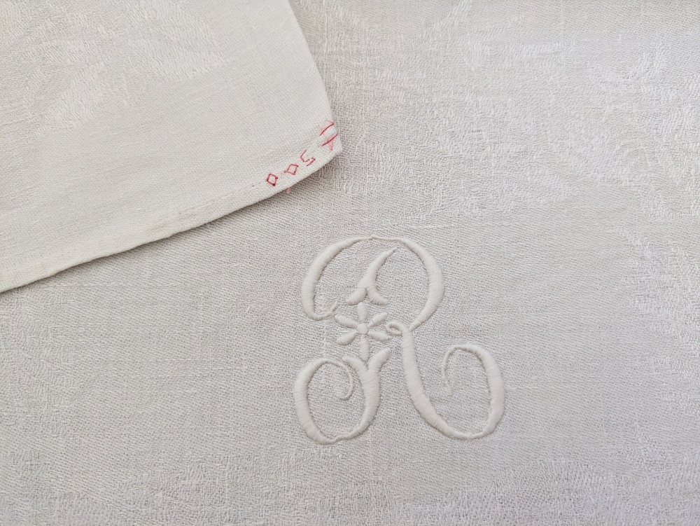 フランスアンティーク イニシャル手刺繍R ダマスク織リネンクロス