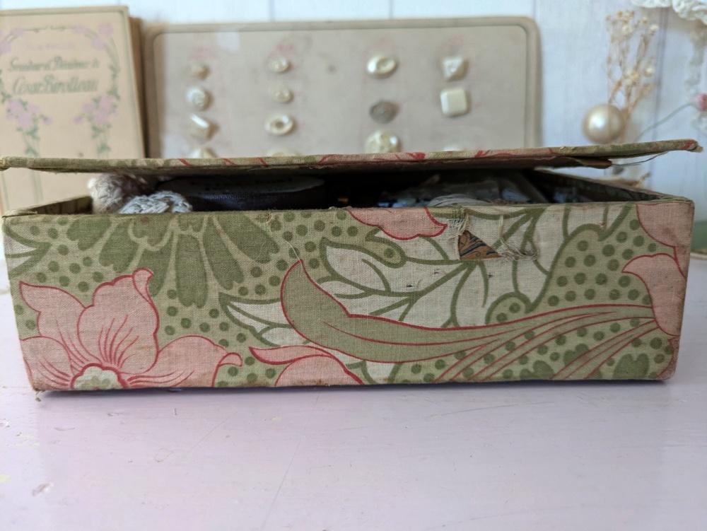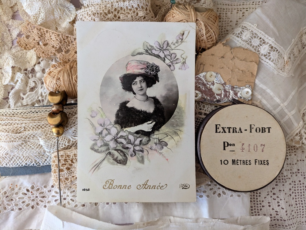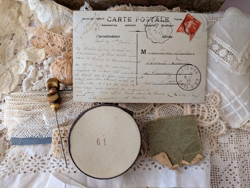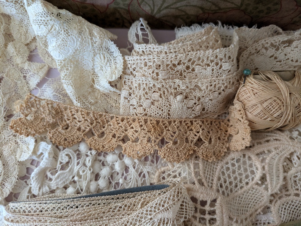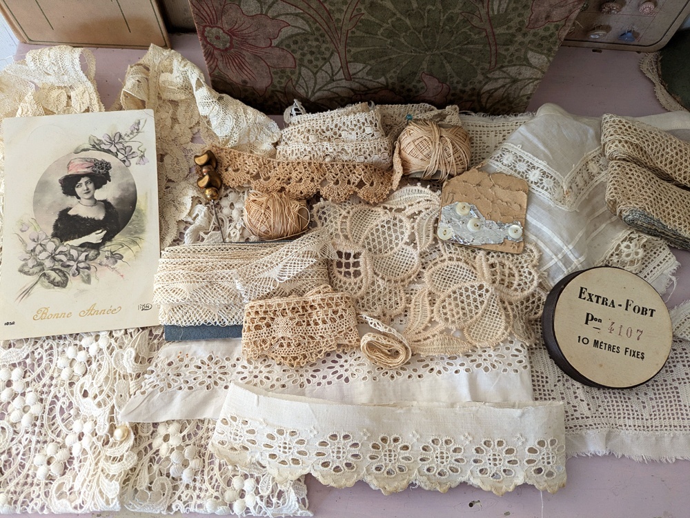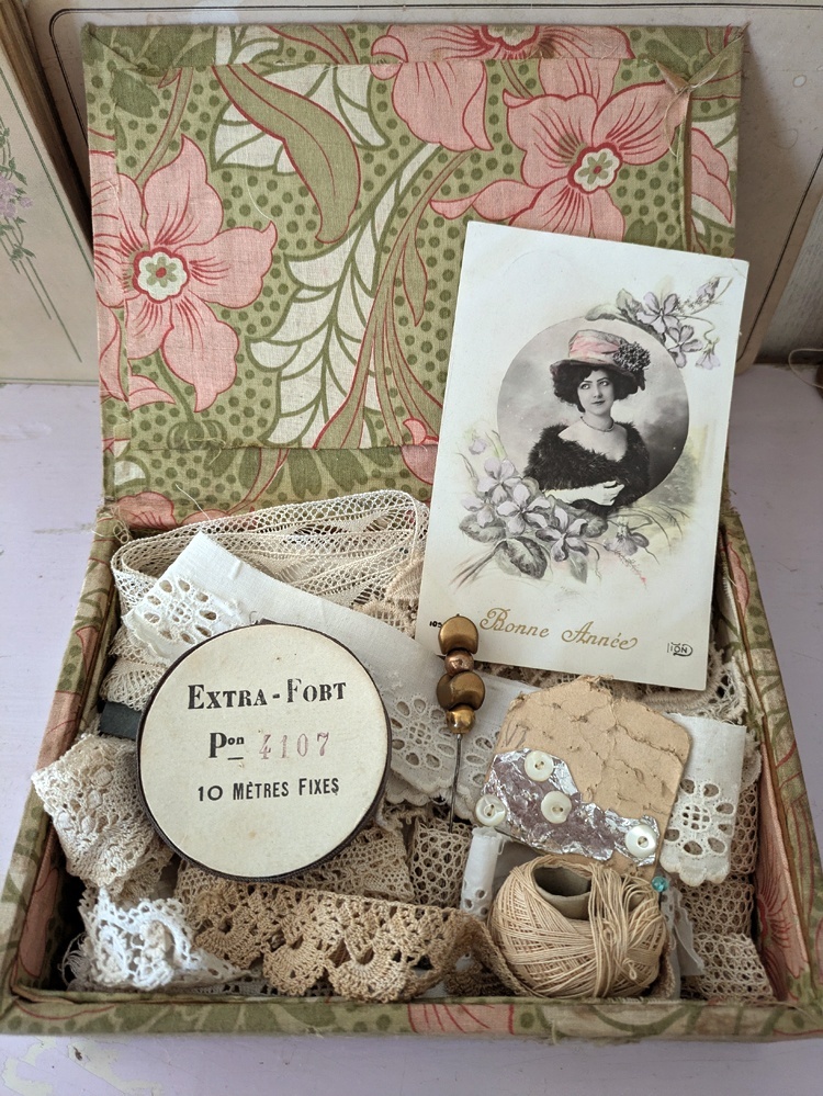 - > フランスアンティーク カルトナージュボックス入りたっぷりレースセット おまけつき