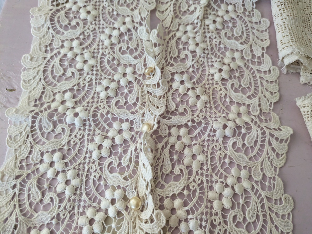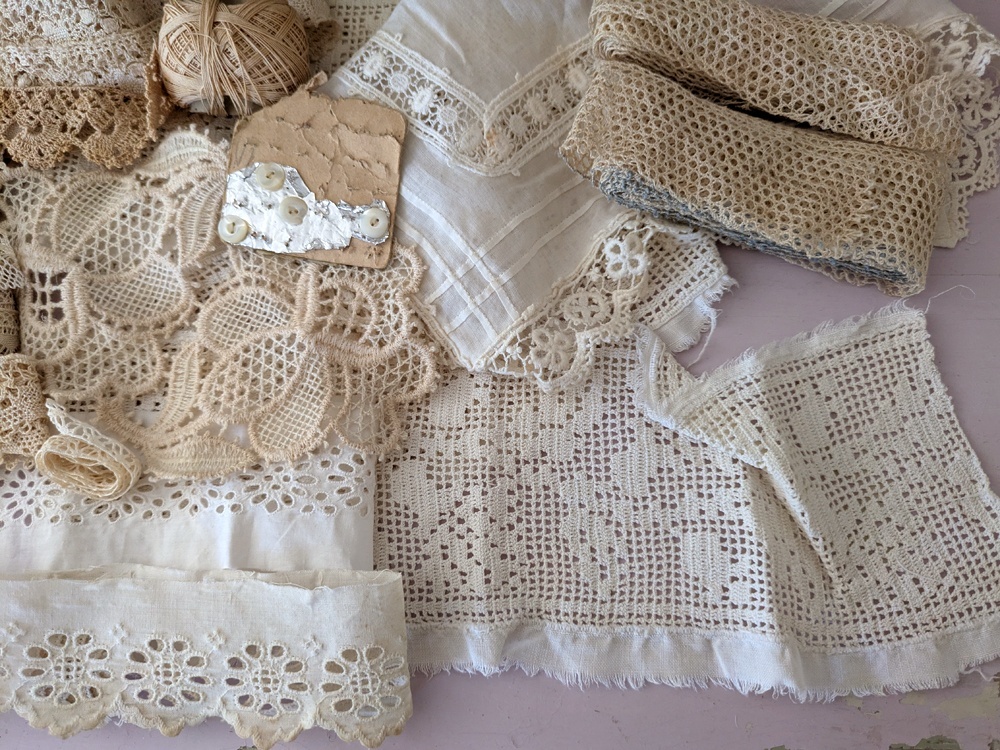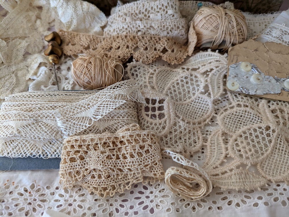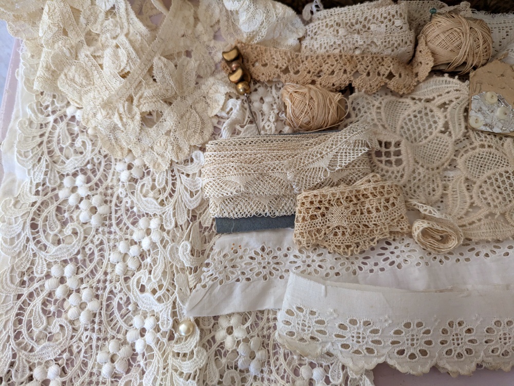 各種レース、レースのつけ襟、レース用糸巻き、リボン、貝ボタン、ハットピンなどなど