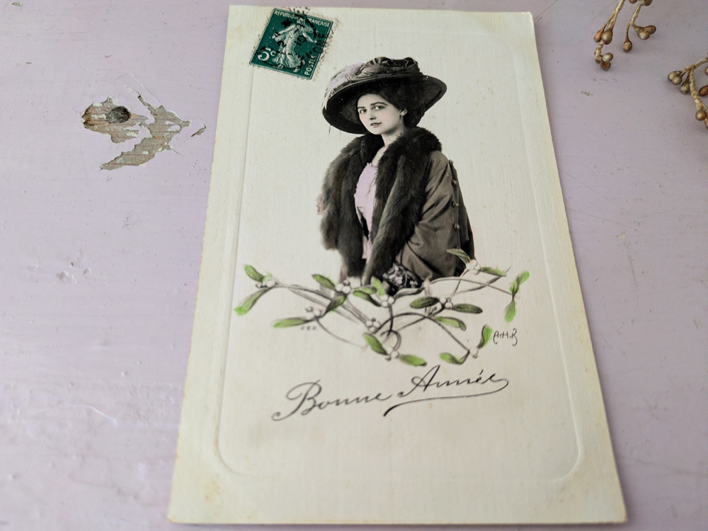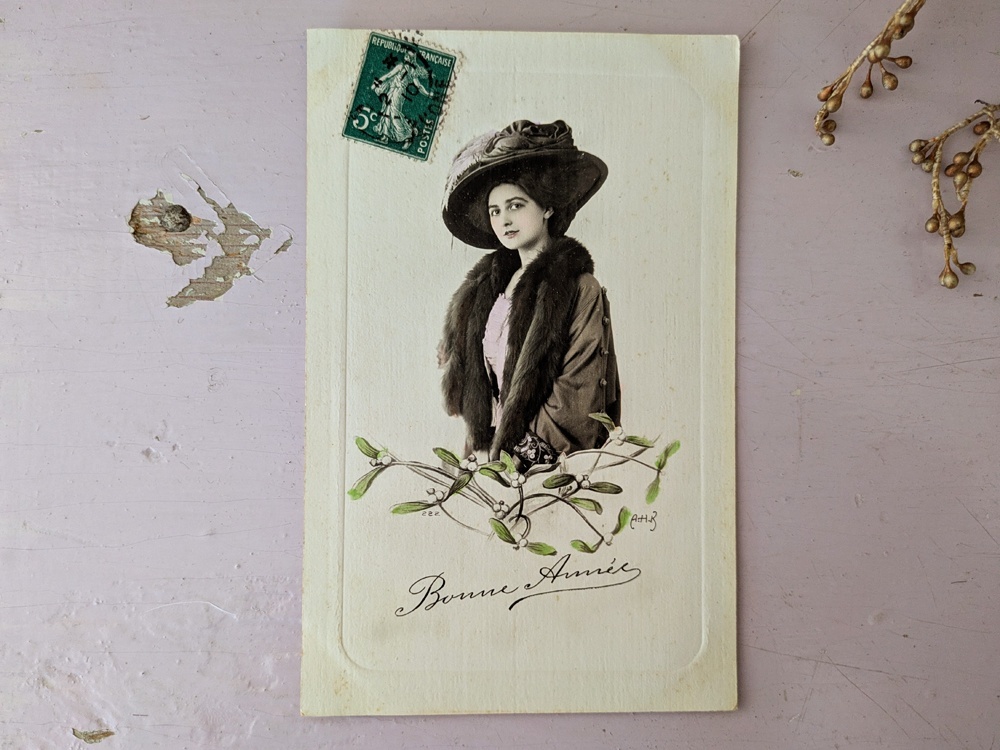 - > フランス 1900-1920年 Bonne Année 切手つきポストカード 女性とヤドリギ