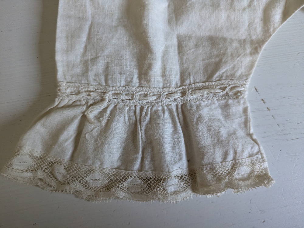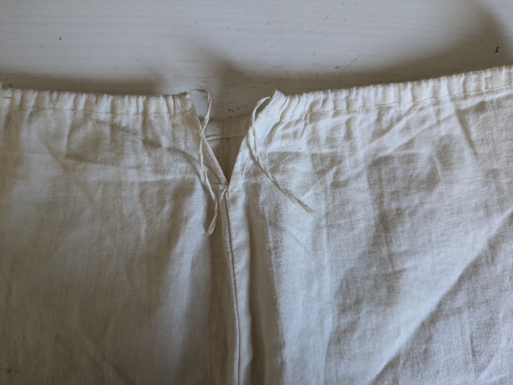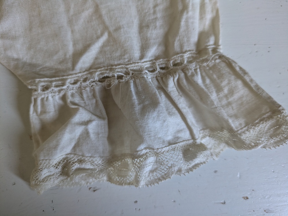 片側の裾のリボン/ひも通し穴に細いリボンが残っています。