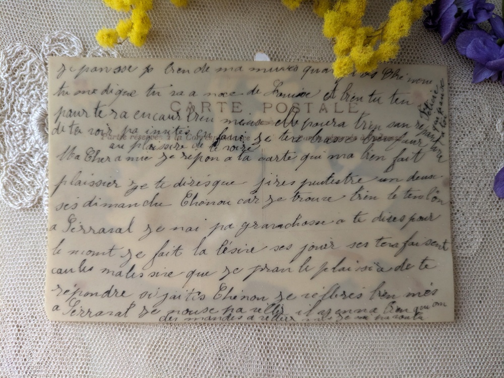 セルロイドのカードにスミレとスズランのパニエがコラージュされた特別なポストカードです。