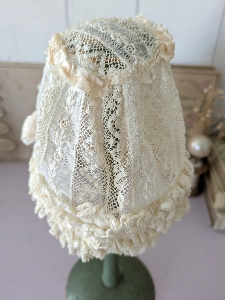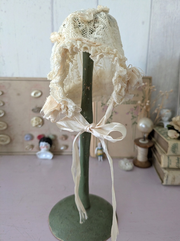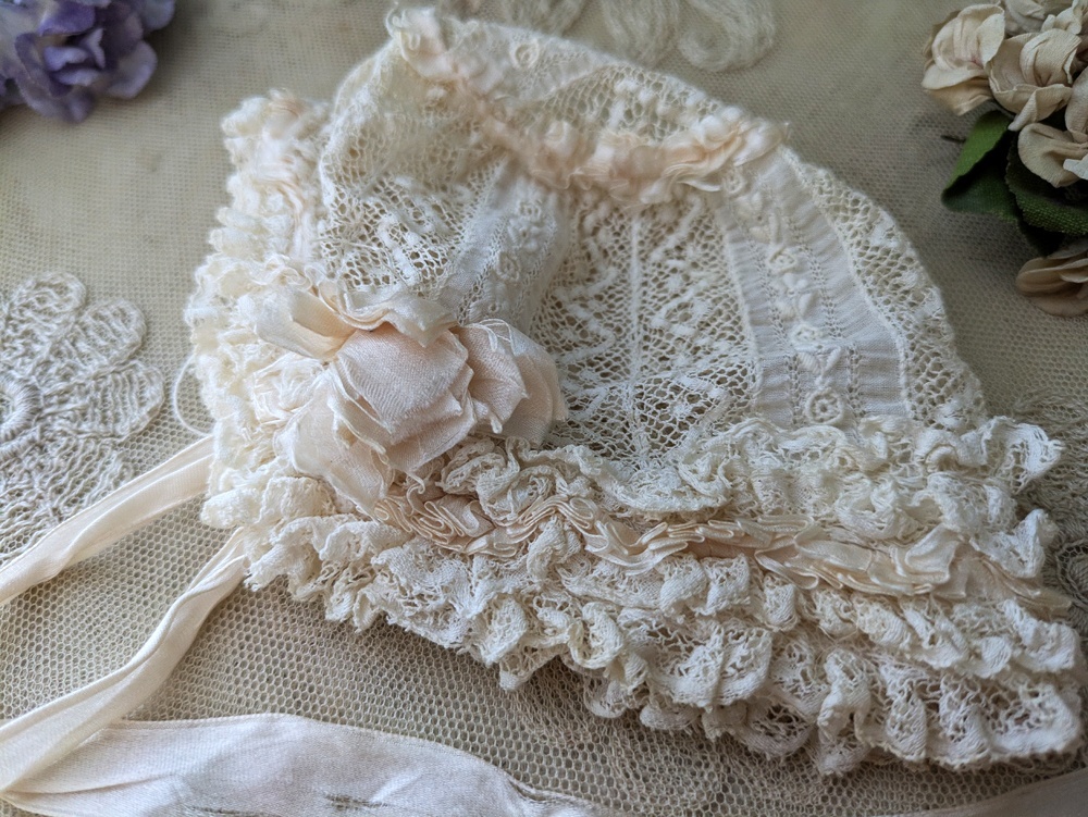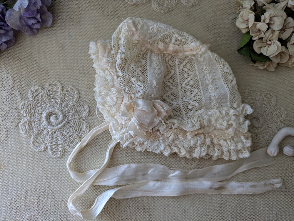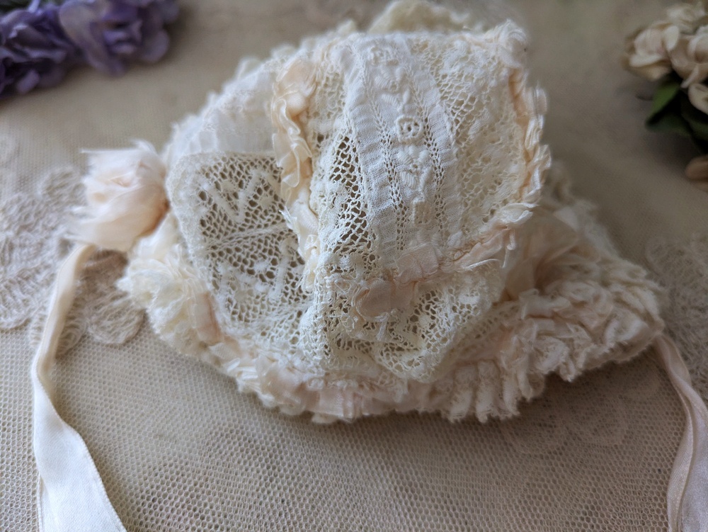 レースとシルクリボンのフリルたっぷりなドール用の小さなボネです。
