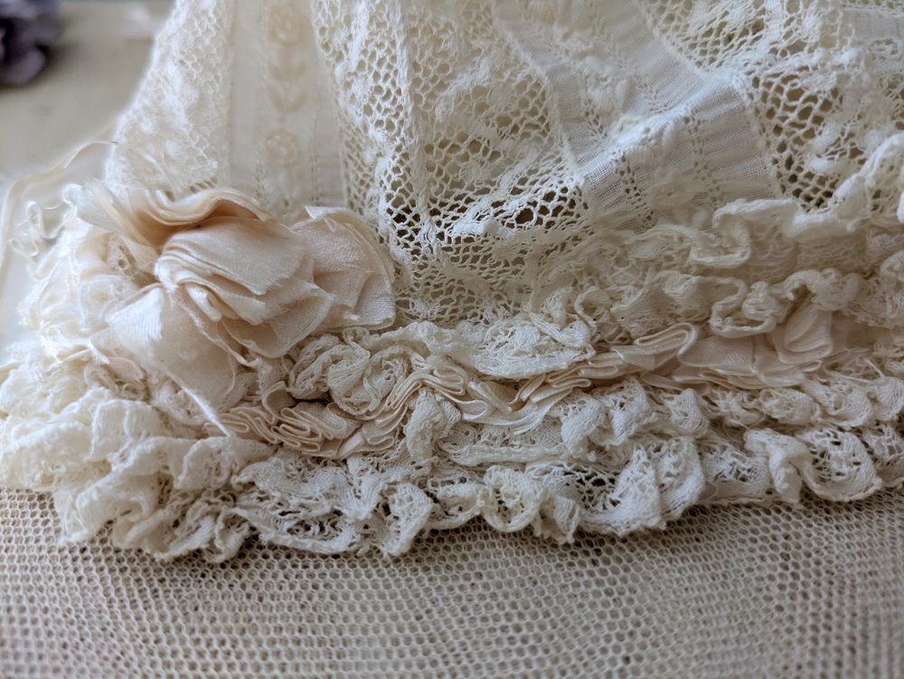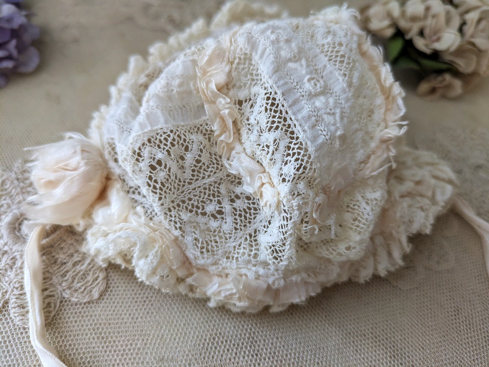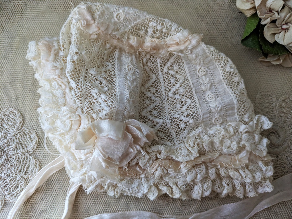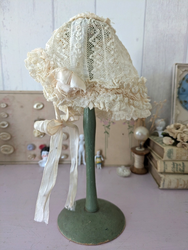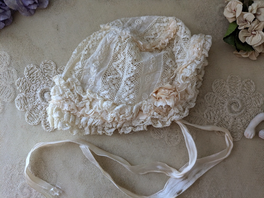 レースとシルクリボンのフリルたっぷりなドール用の小さなボネです。