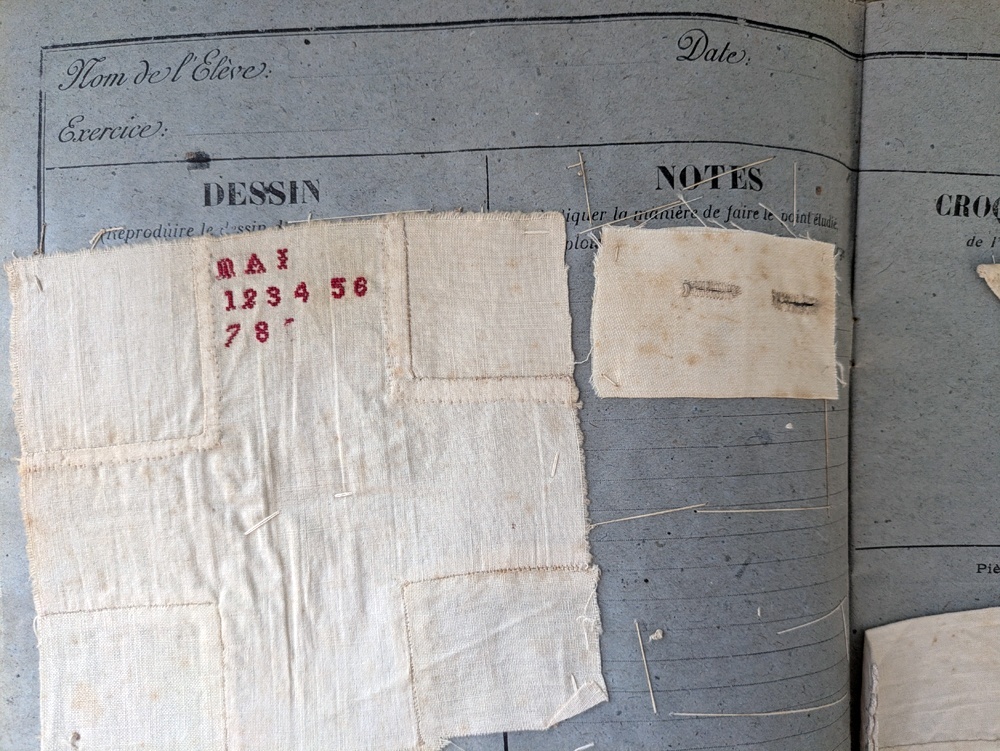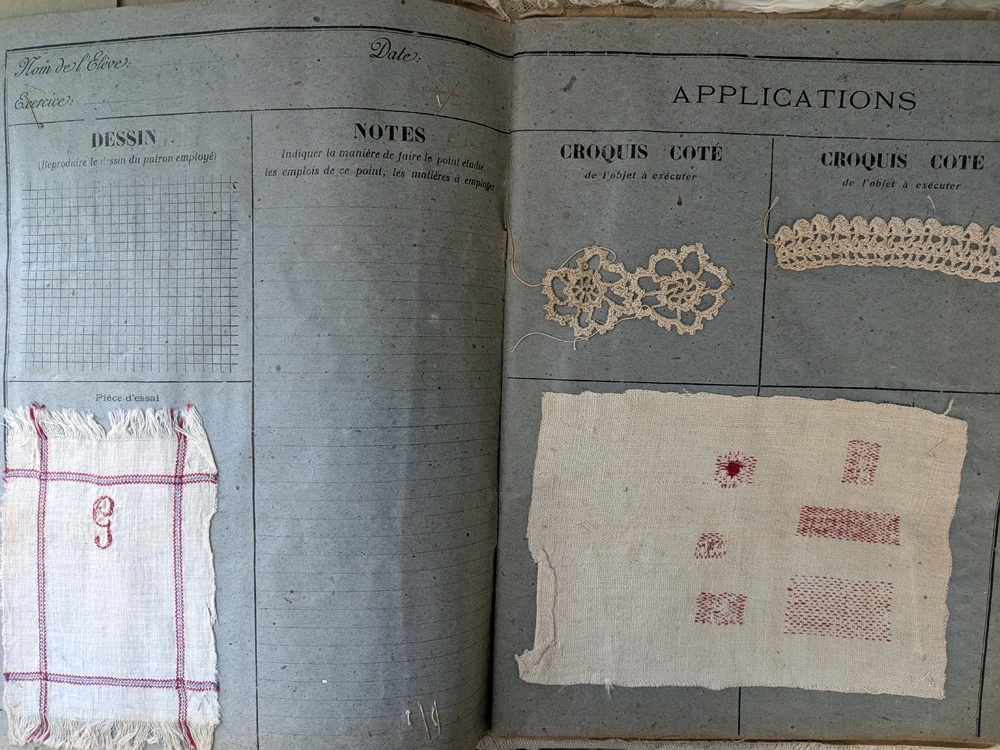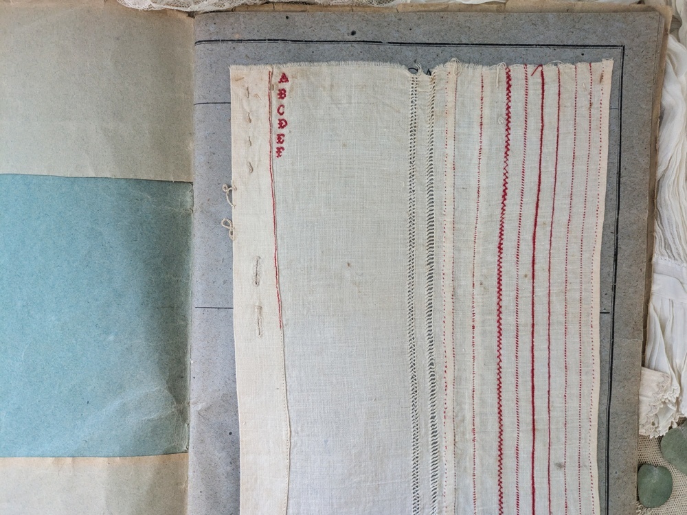 刺繍やレース編み、ボタンホールなど少女の小さな練習作品が並んだ可愛く希少なノートです。