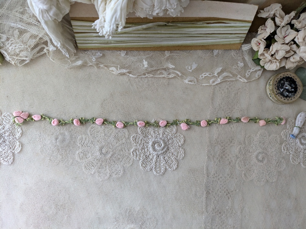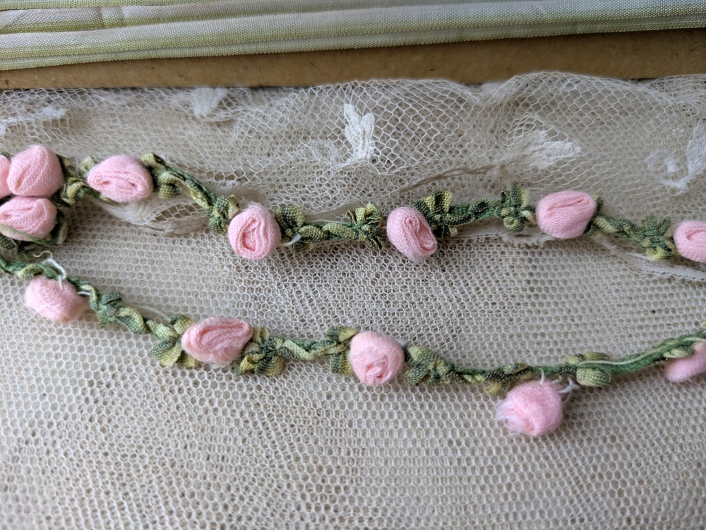 - > フランス 1900年前後 ばらのロココリボン ピンク×モスグリーン 32cm