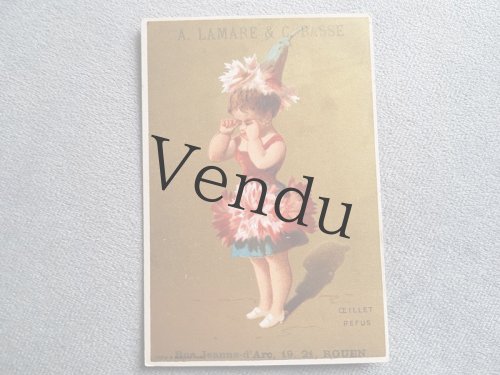 "Chromolithographie クロモリトグラフィー" とは石版多色刷りのことで1836年ドイツ人のGodefroy Engelmannによって開発されました。このカードが出てきたのが1800年台後半から、お菓子屋さんやショコラティエ、百貨店など商品を包む際にこのカードを添えていたのだとか。同じ時代リトグラフというと画家のロートレック(1864-1901)も有名です。この技術がその時代にどれほど活用されていたか窺い知れる素敵なカードです。