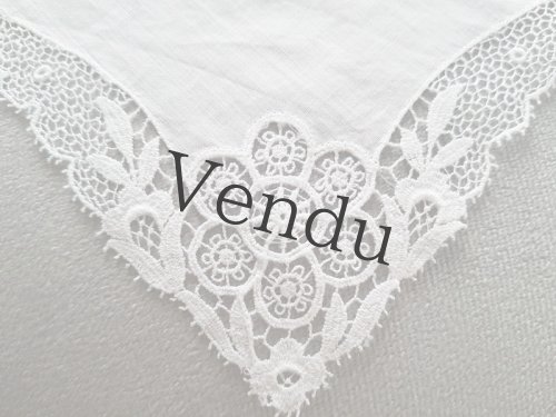 - > フランスアンティーク リボンのカットワークと白刺繍のハンカチ